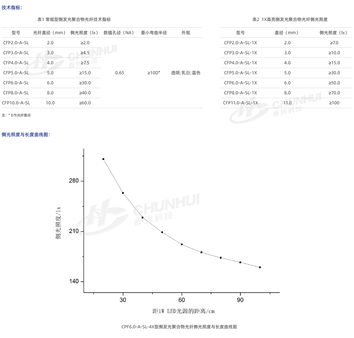 在波長(zhǎng)650nm處, 常規(guī)型側(cè)發(fā)光聚合物光纖每米透光率大于90%以上,導(dǎo)光距離可達(dá)40m;